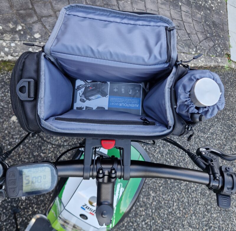 Une des deux poches latérales peut accueillir un bidon ou gourde d’eau, sécurisé par un câble.